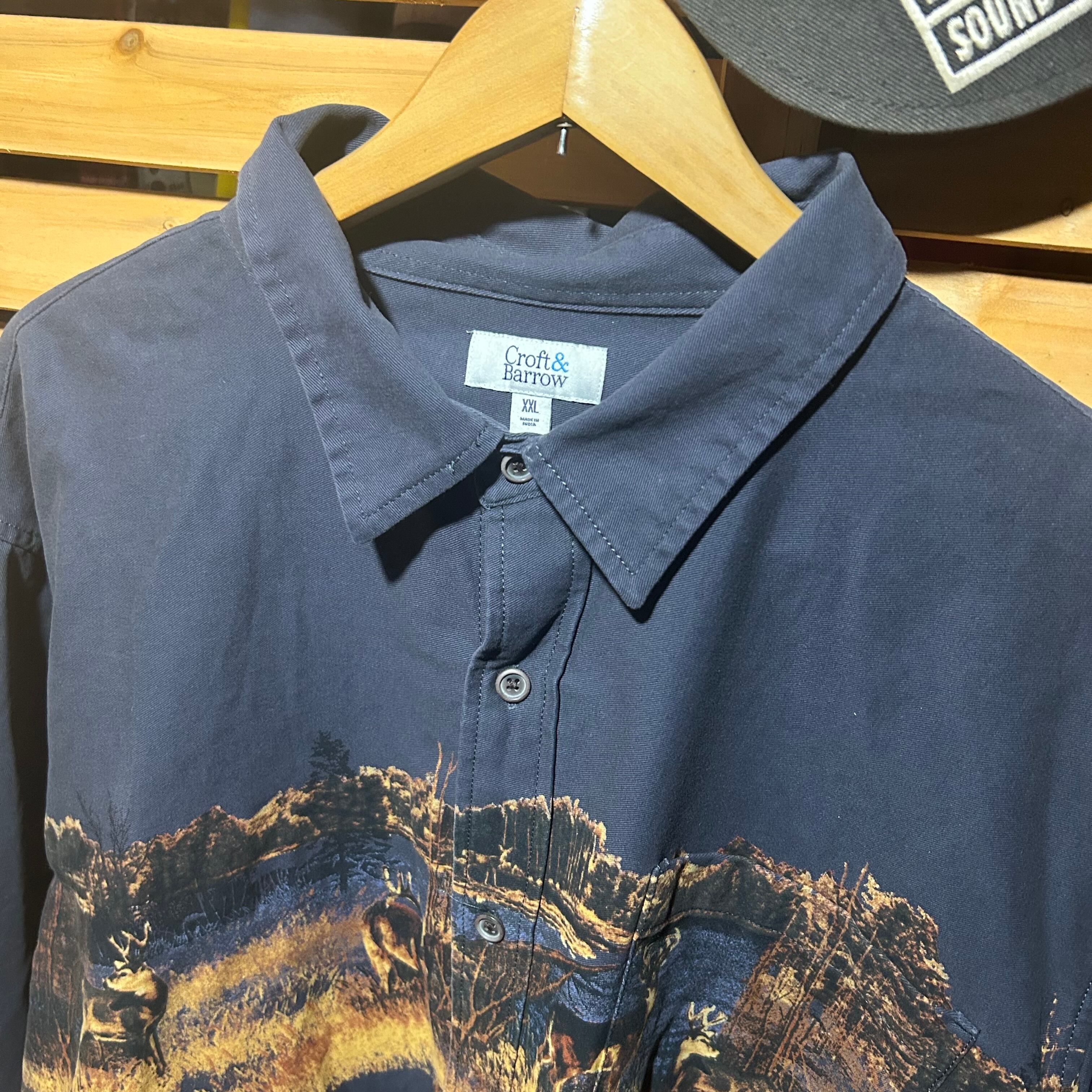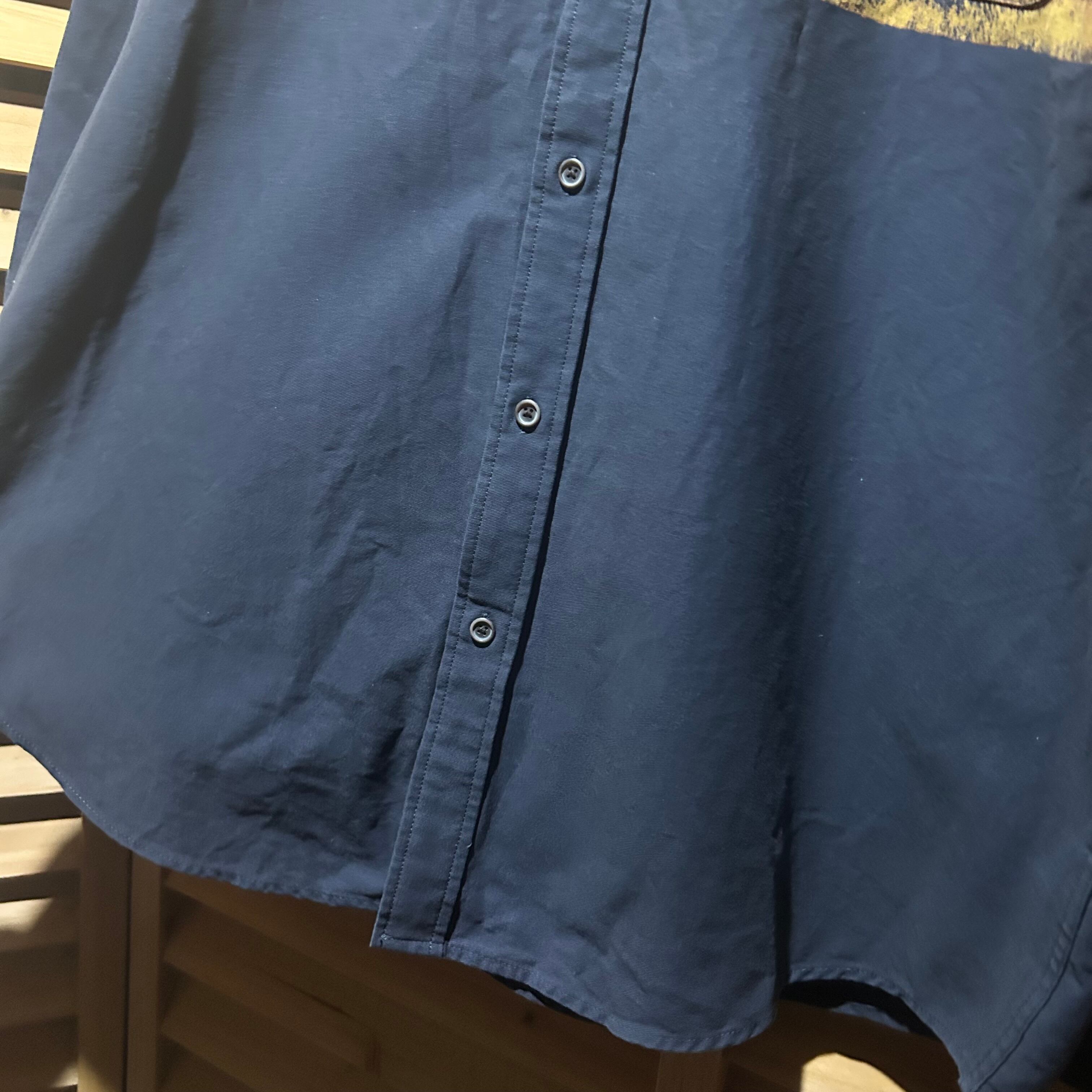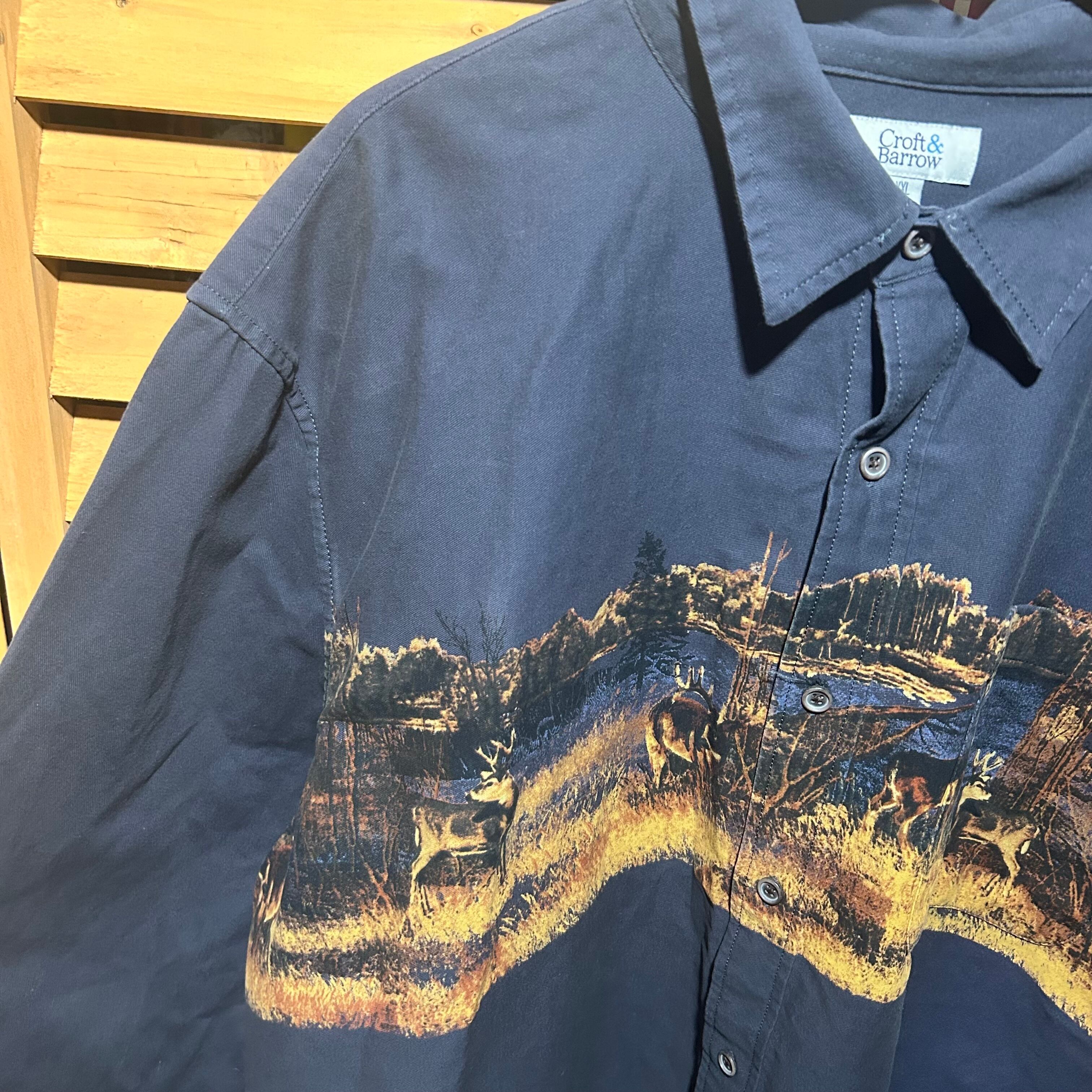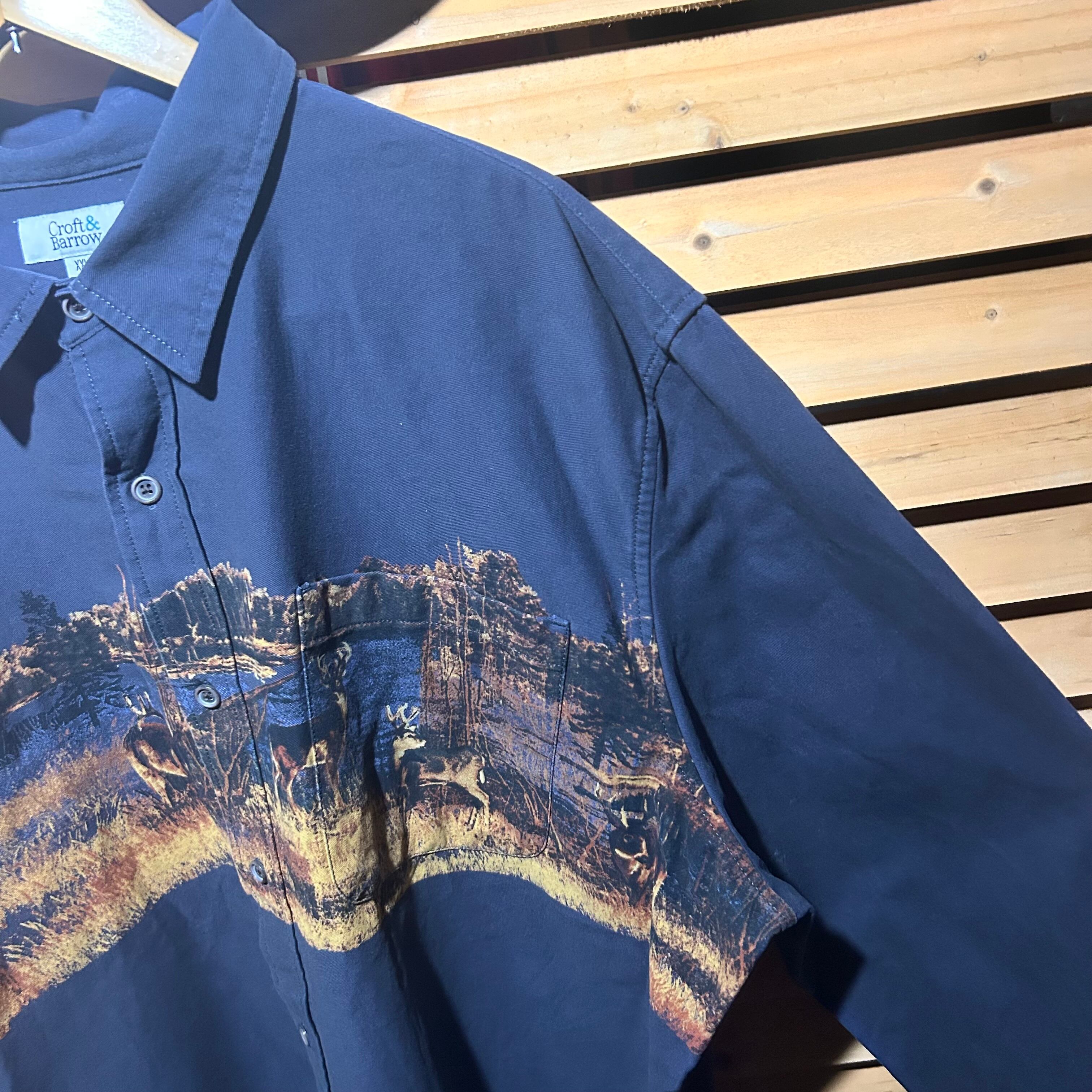 風景プリントが特徴のネイビーのボタンダウンシャツ。