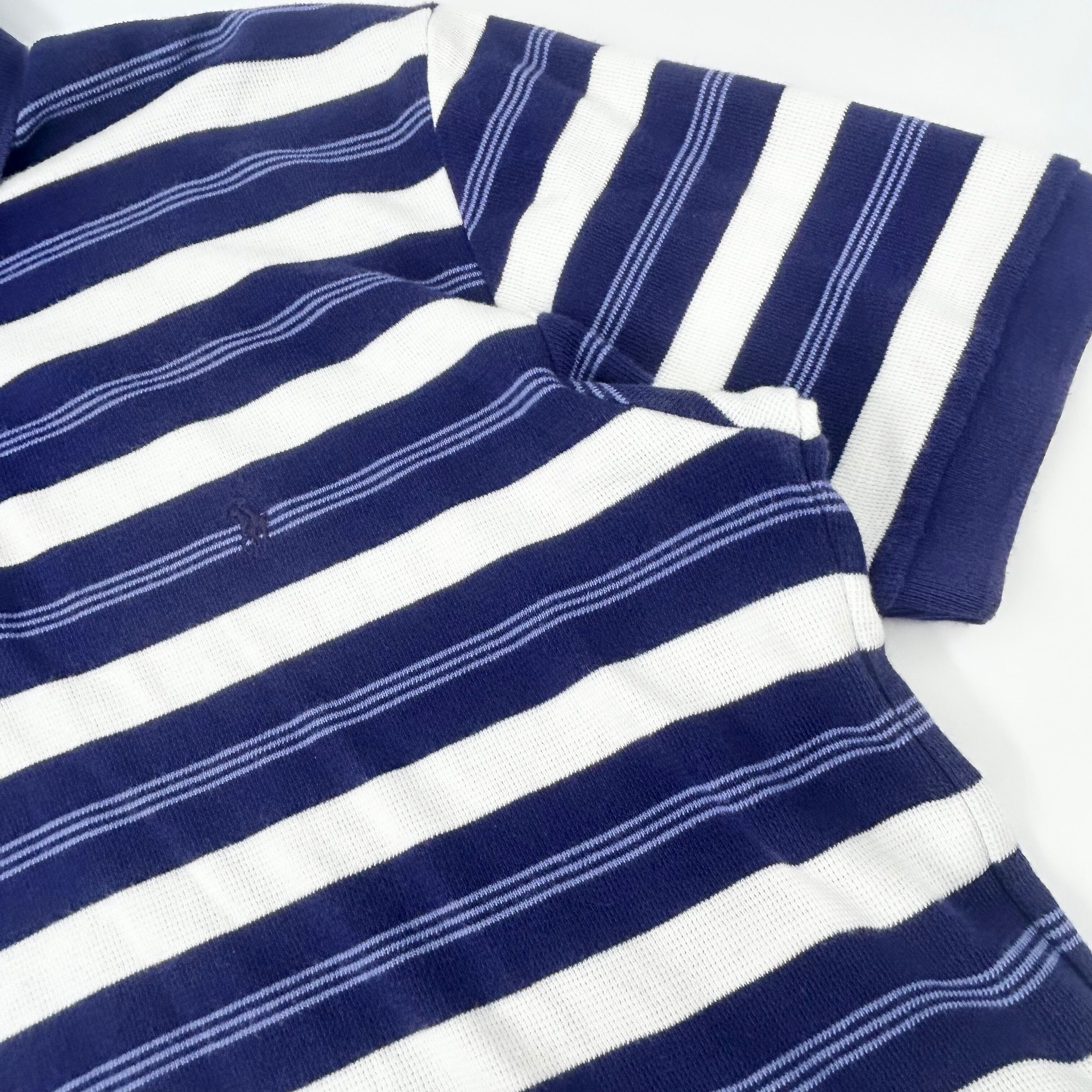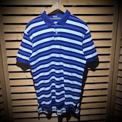 青と白のストライプが特徴のポロシャツで、カジュアルなスタイルに最適。