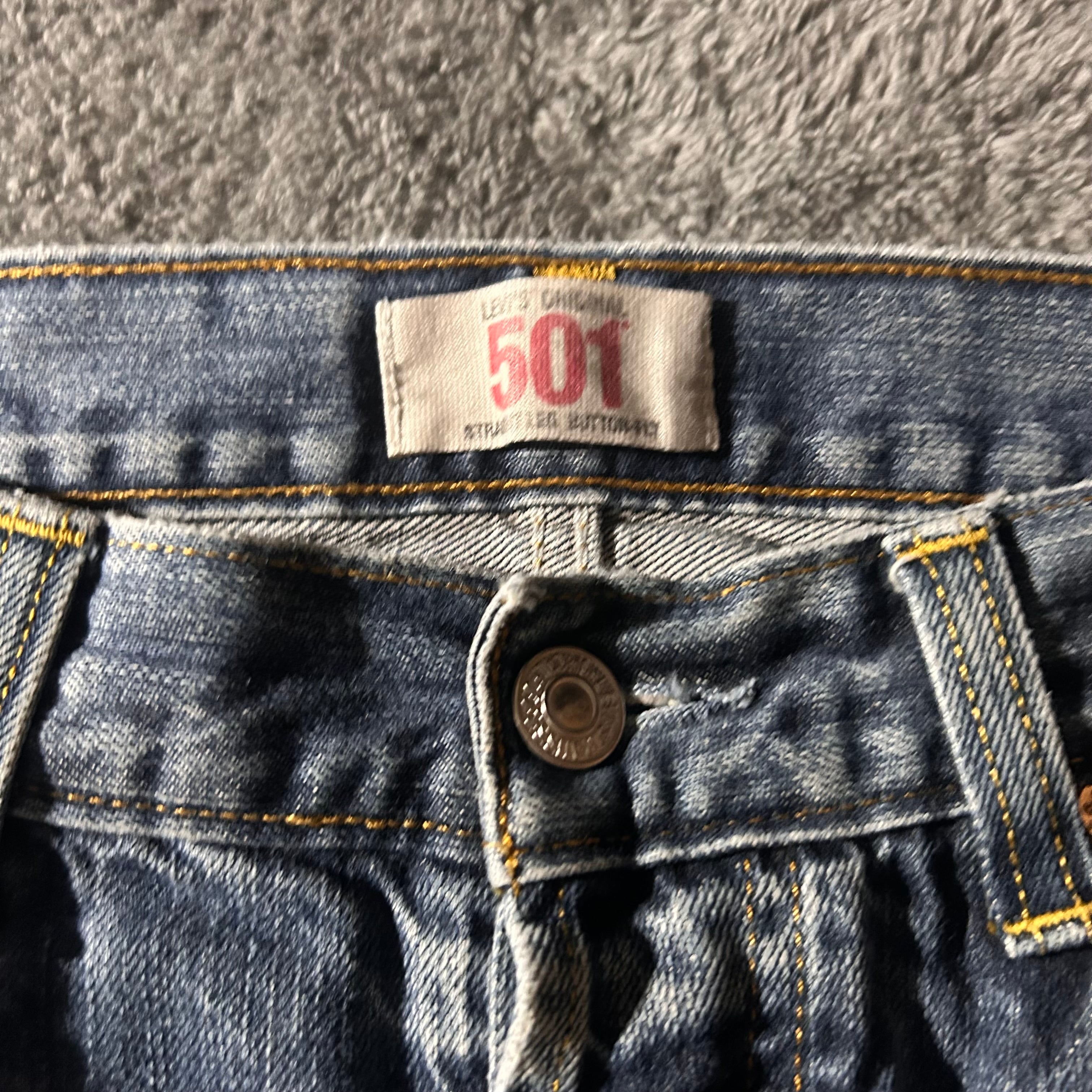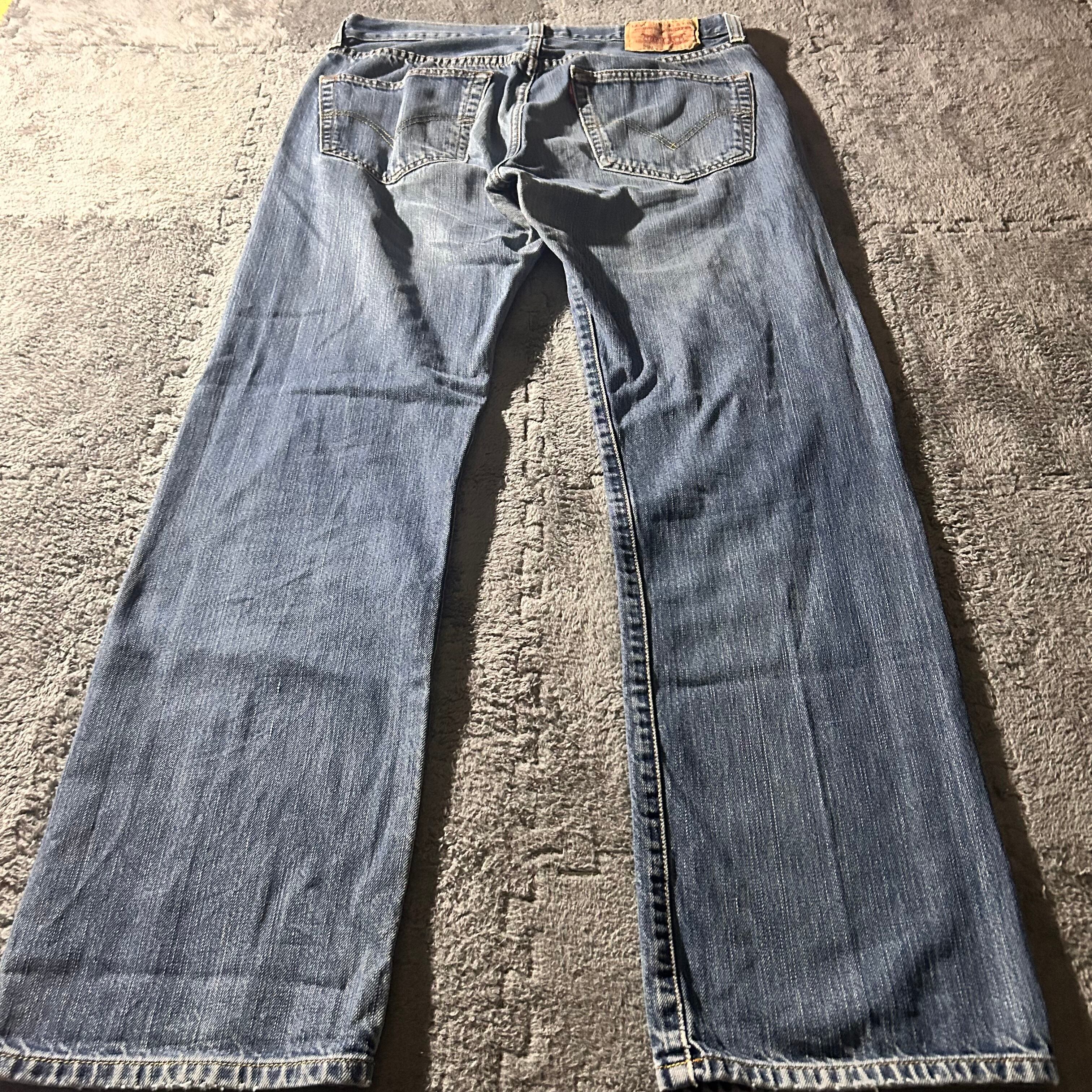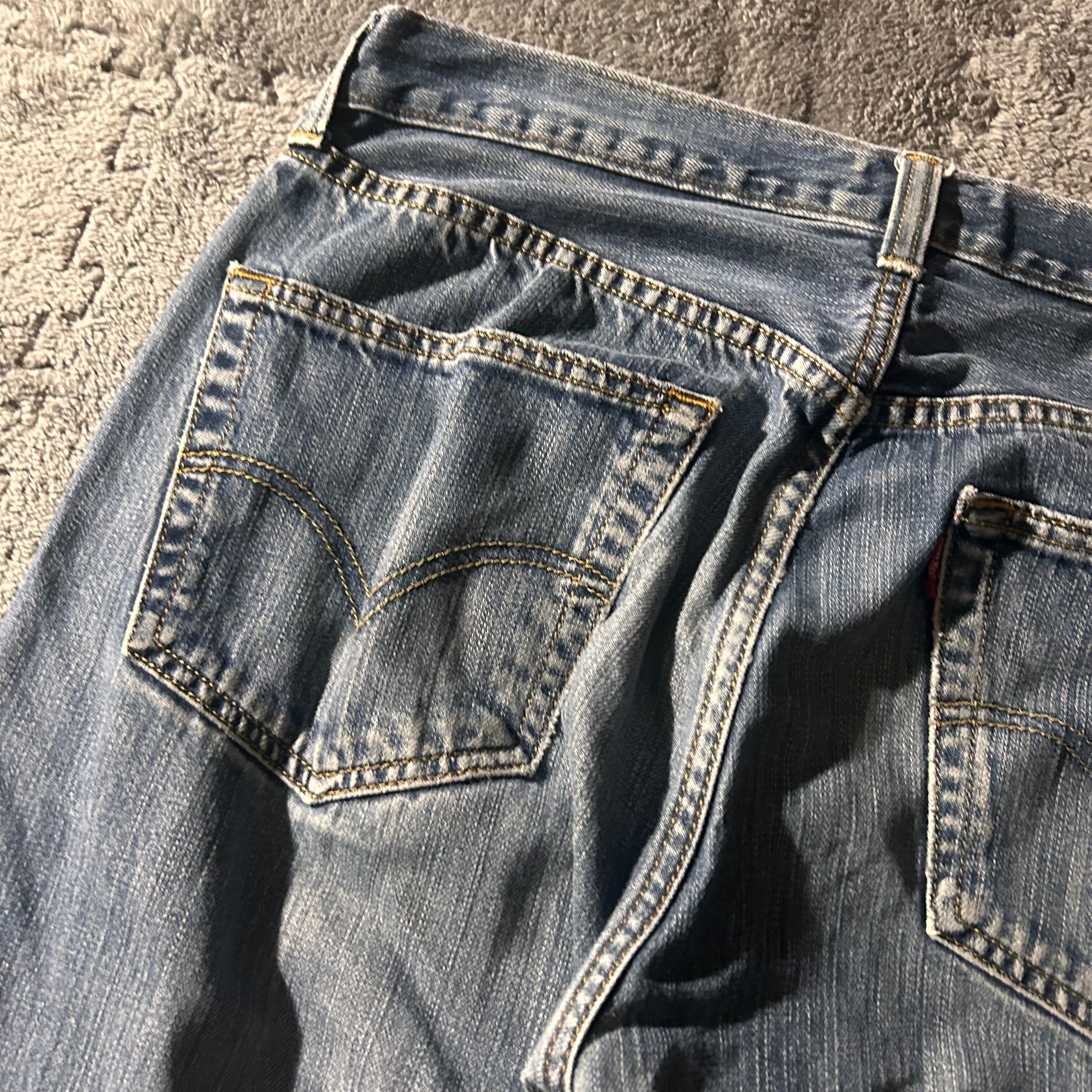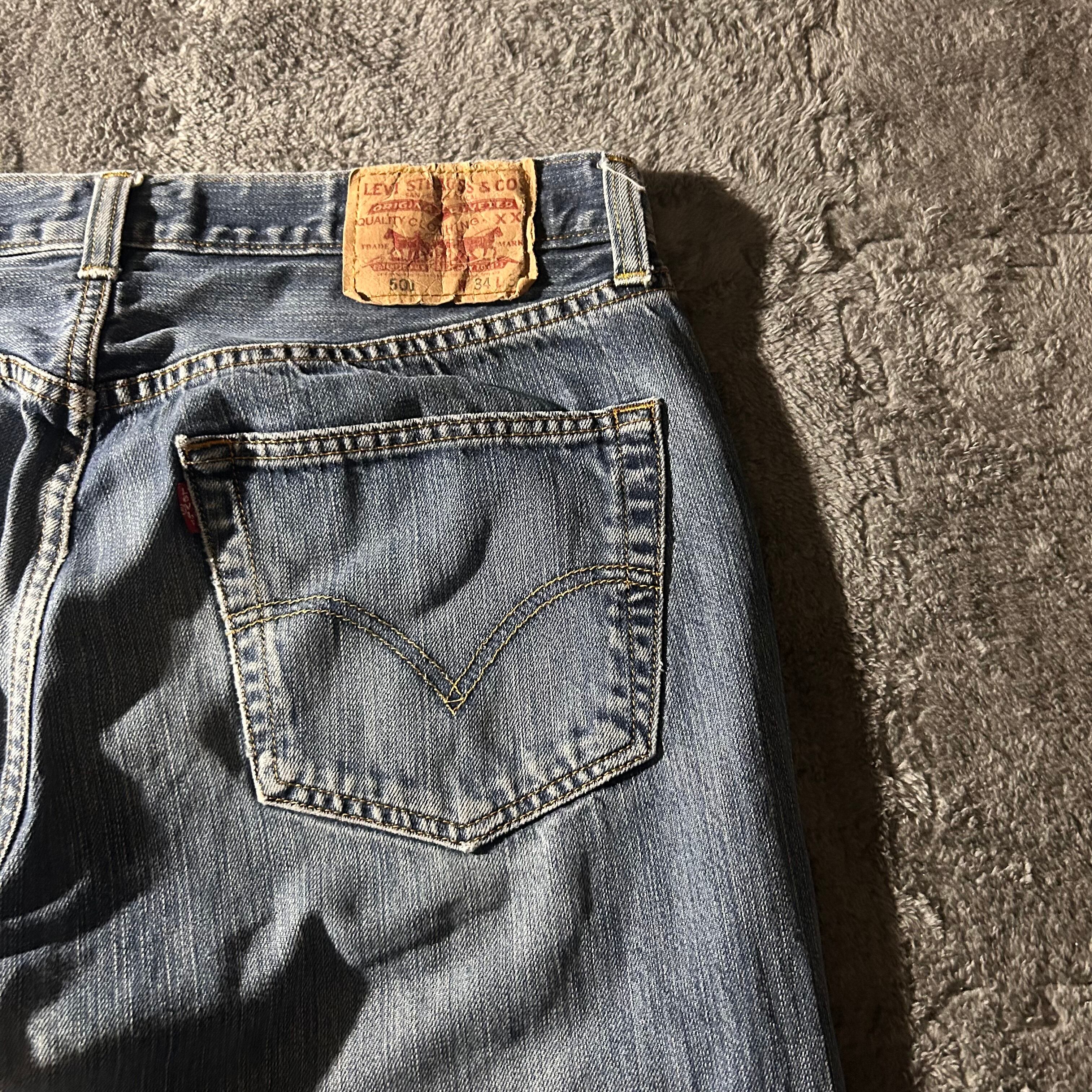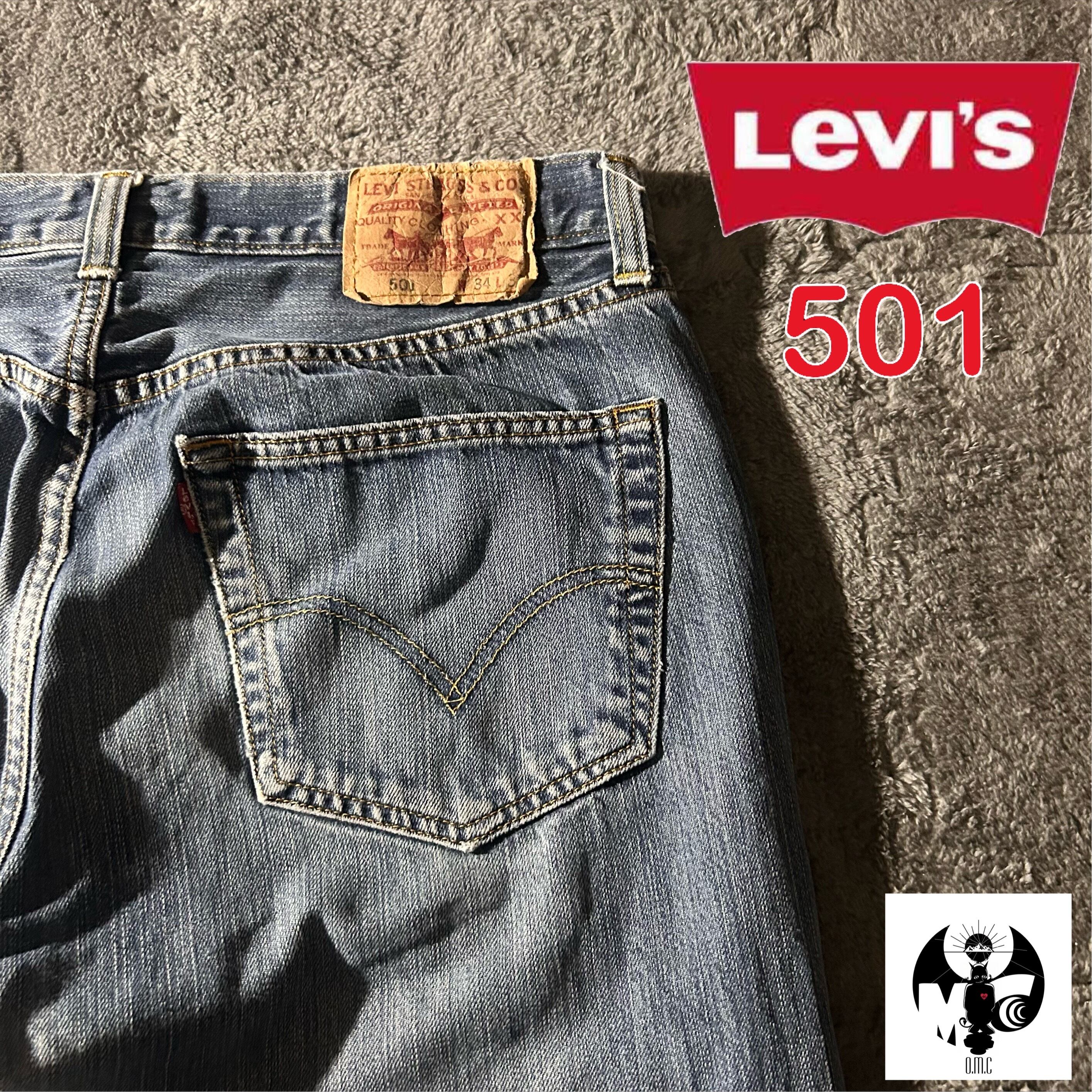 Levi's 501 ストレートデニム、ライトブルーの色合いで、カジュアルスタイルに最適。