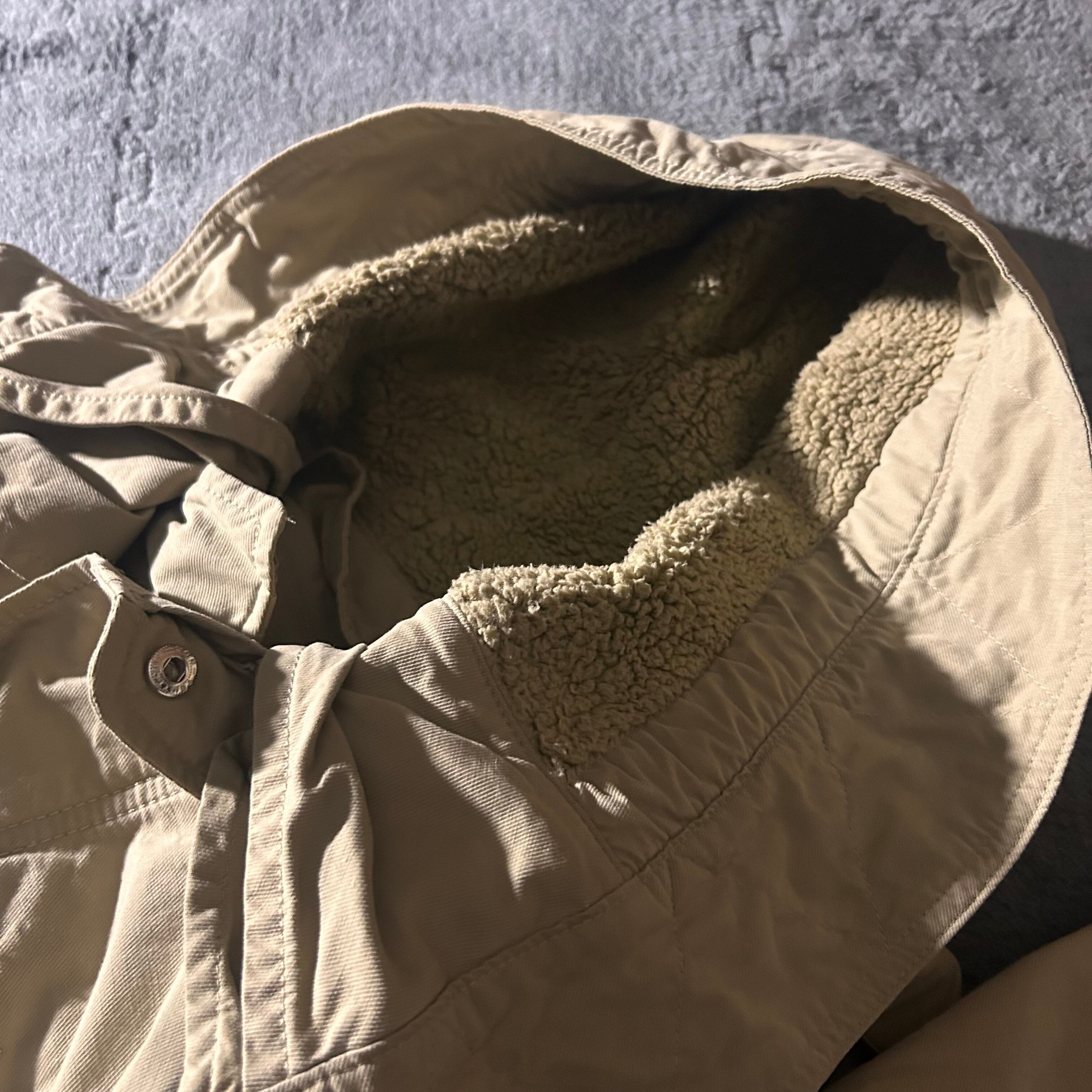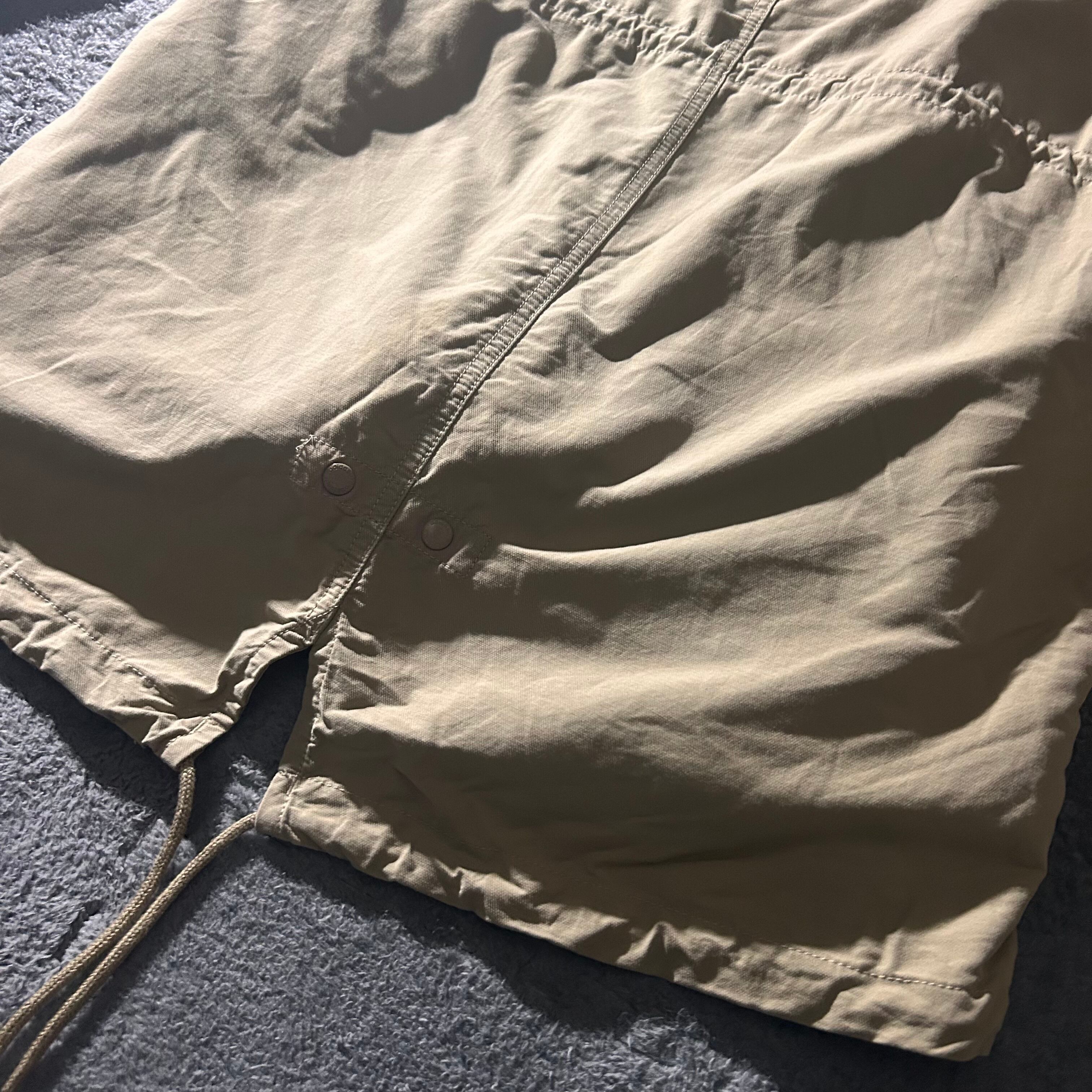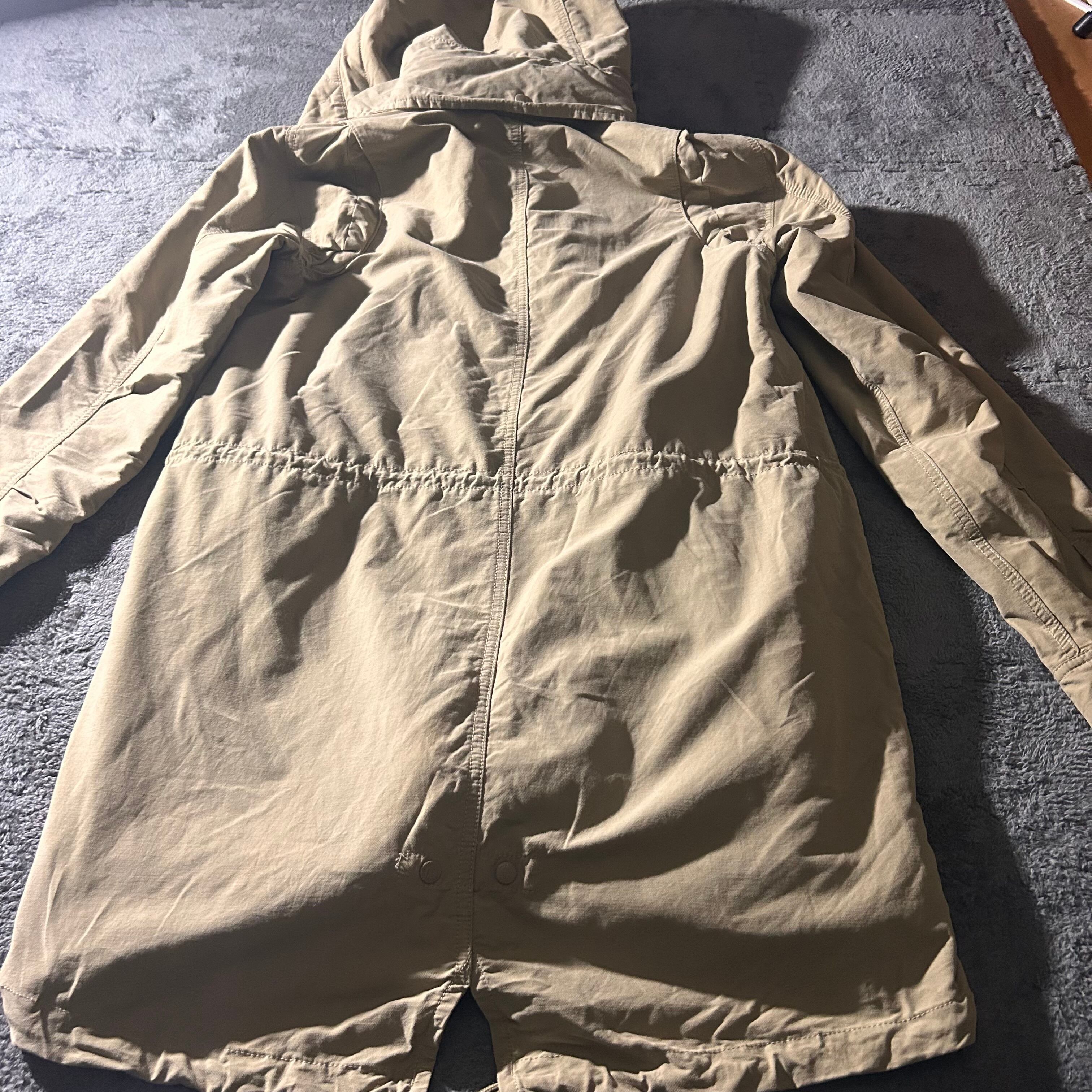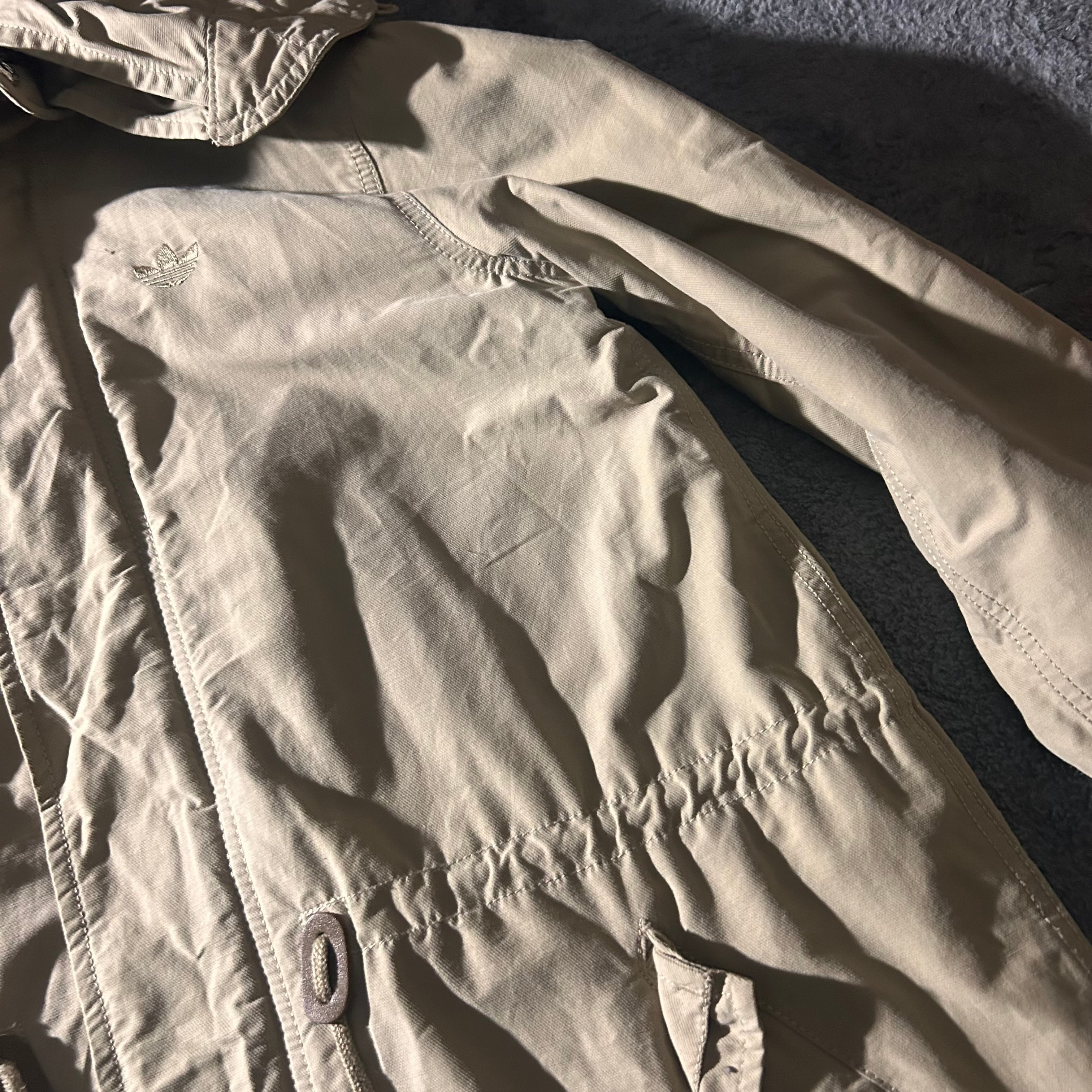 フード付きのベージュジャケット、調整可能なウエストドローコード付き。