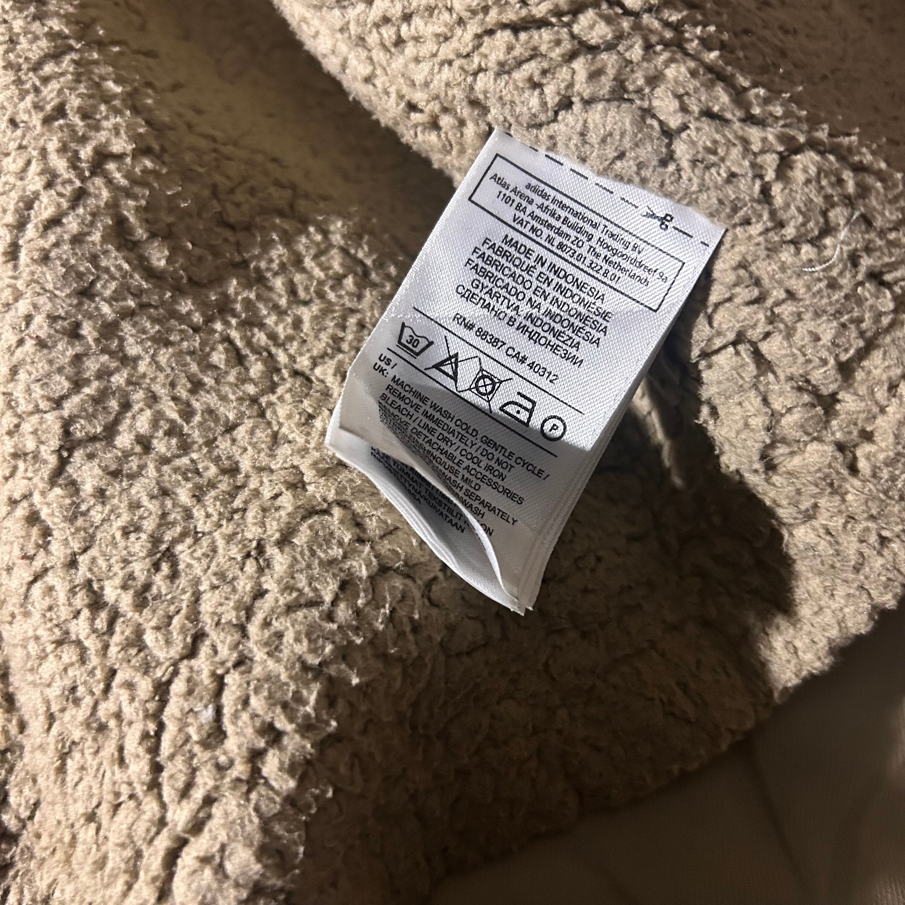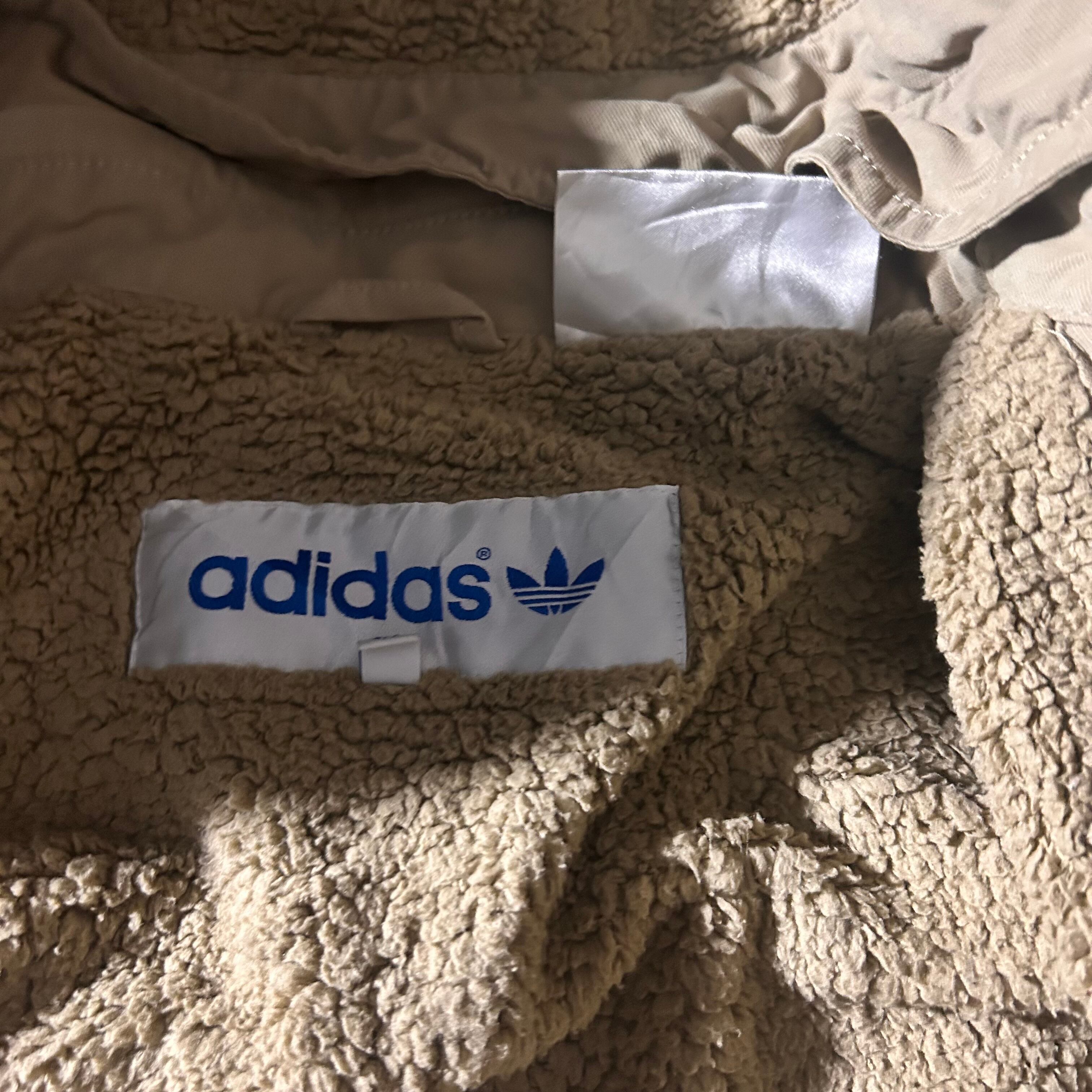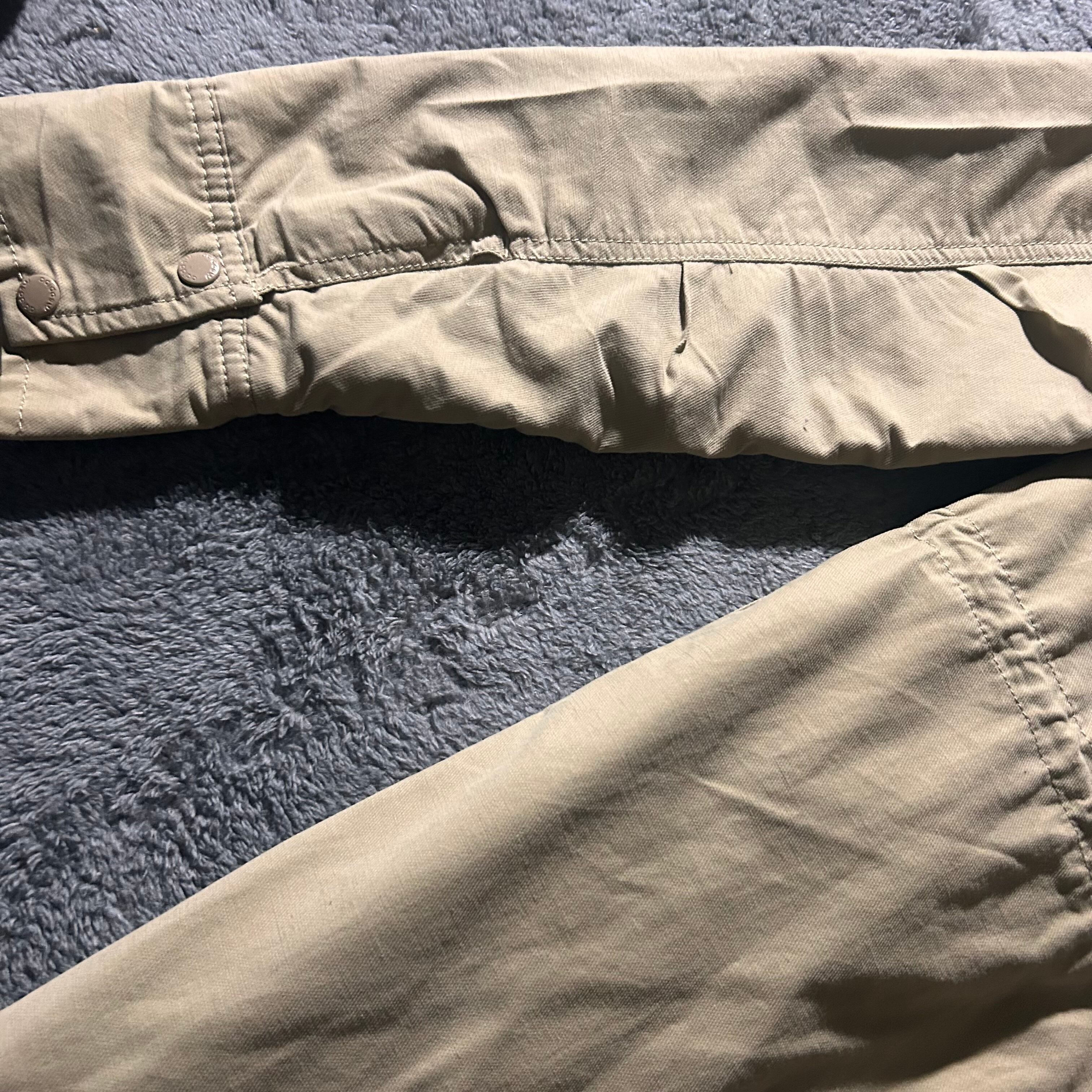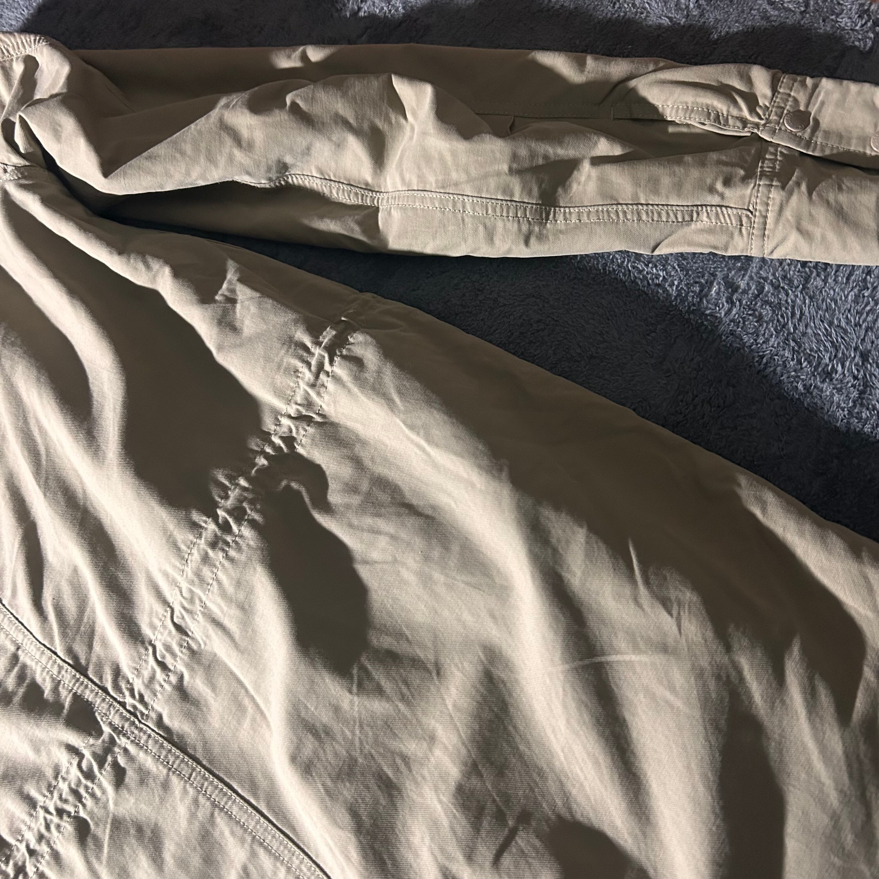 フード付きのベージュジャケット、調整可能なウエストドローコード付き。