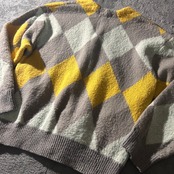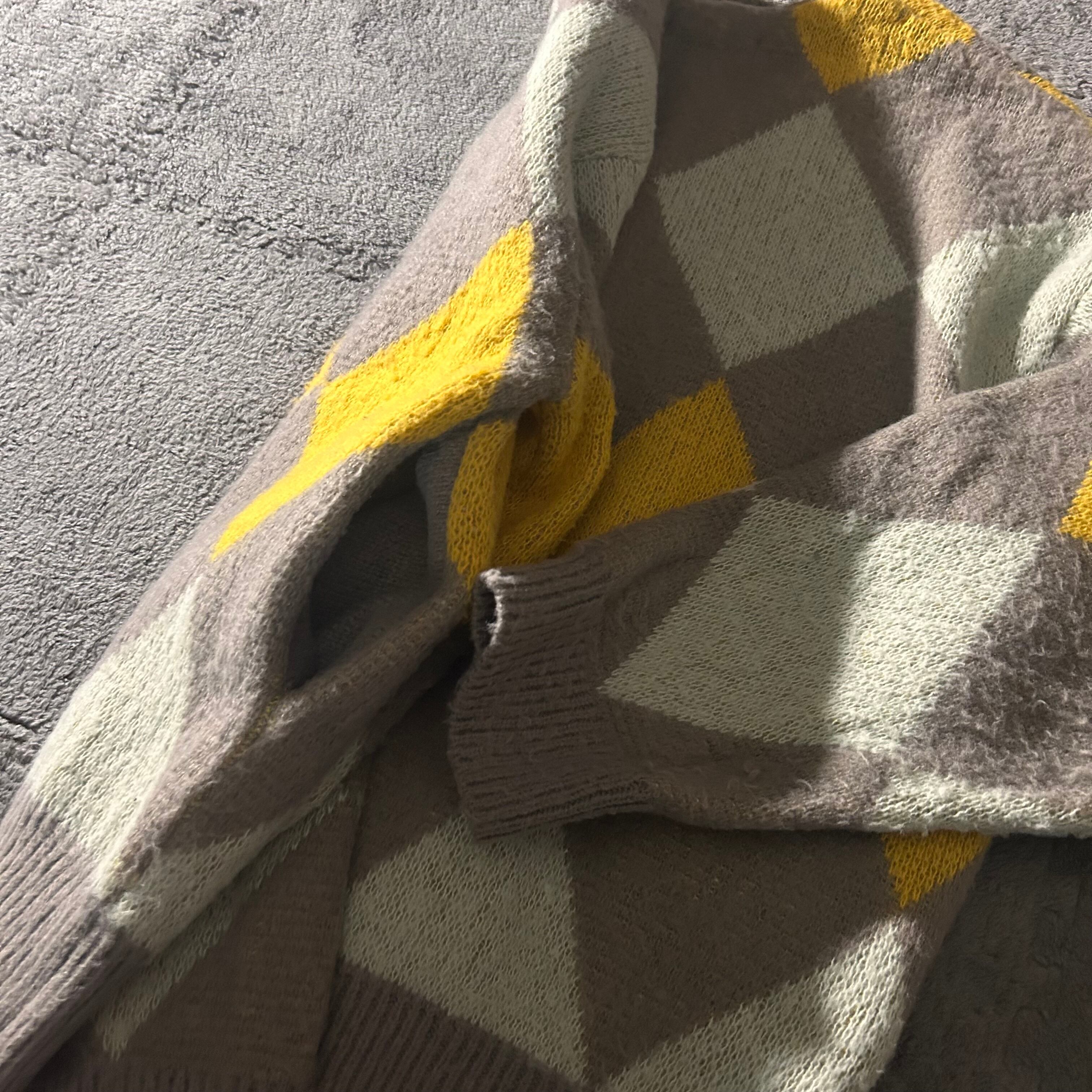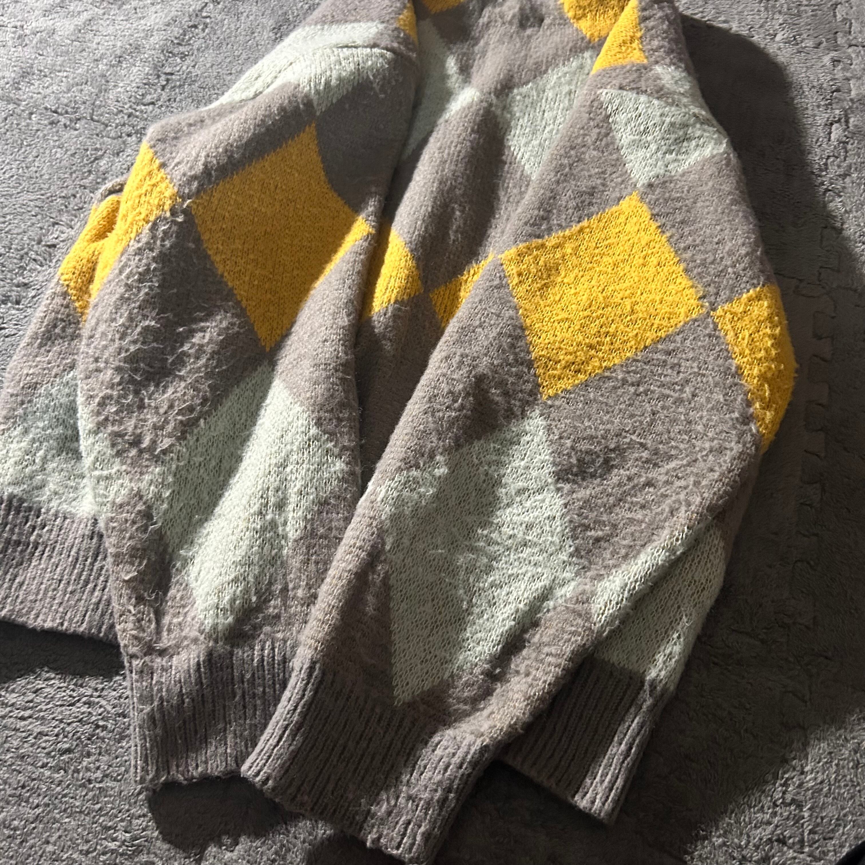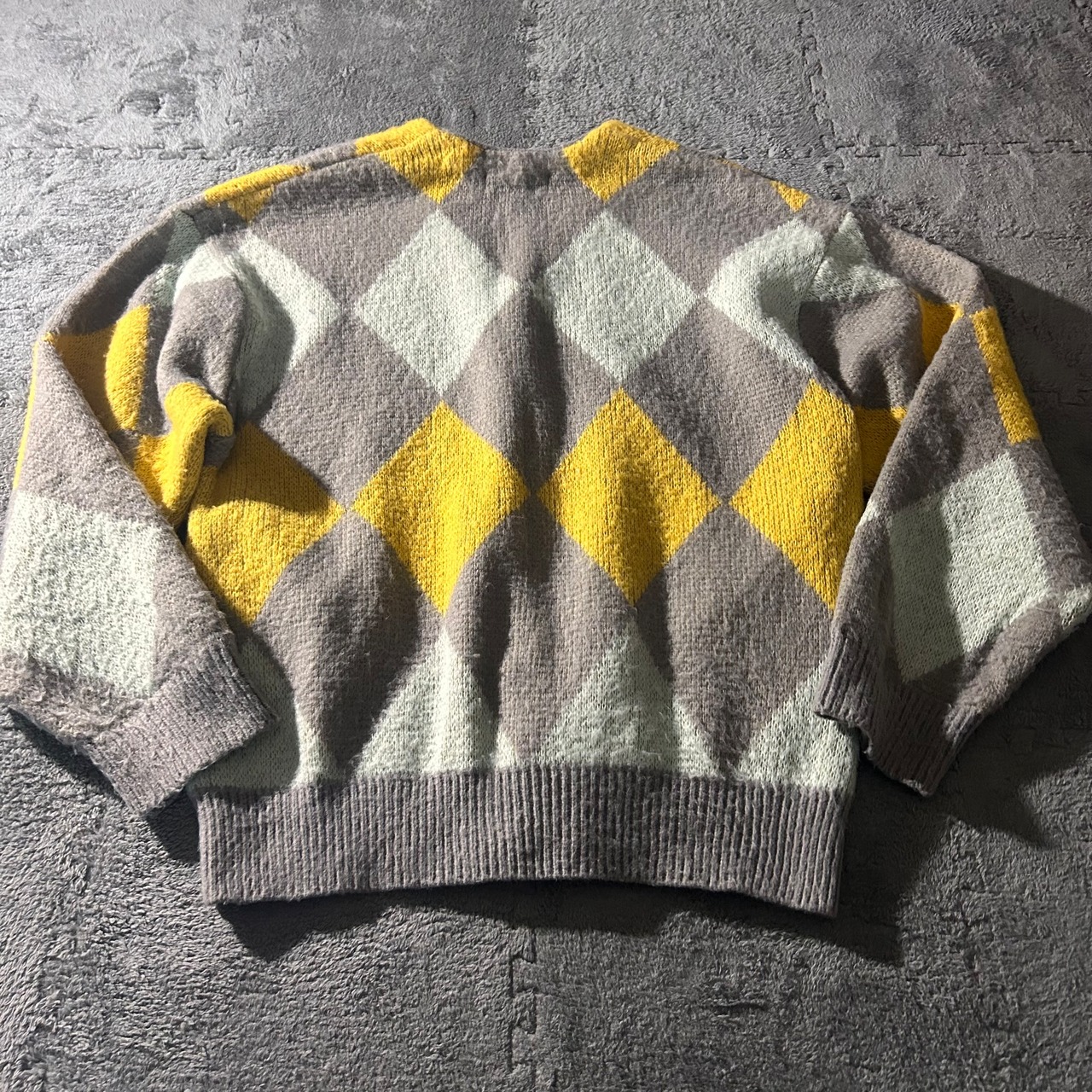 アーガイルパターンのニットセーター、Lサイズ、グレーとイエローの配色が特徴。