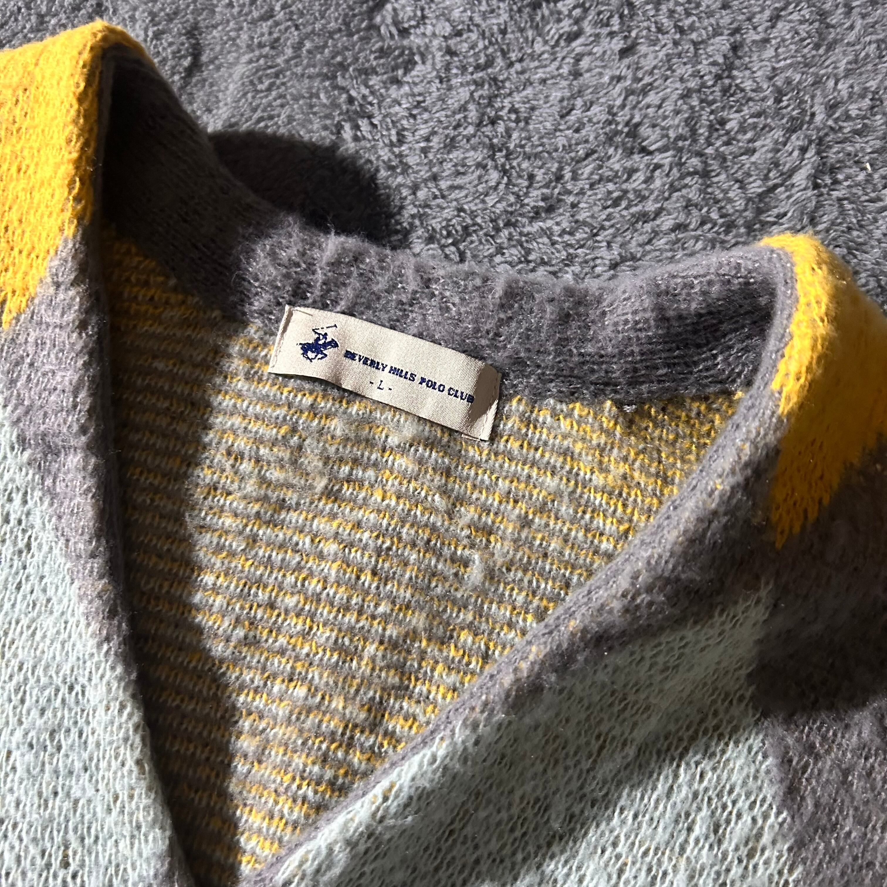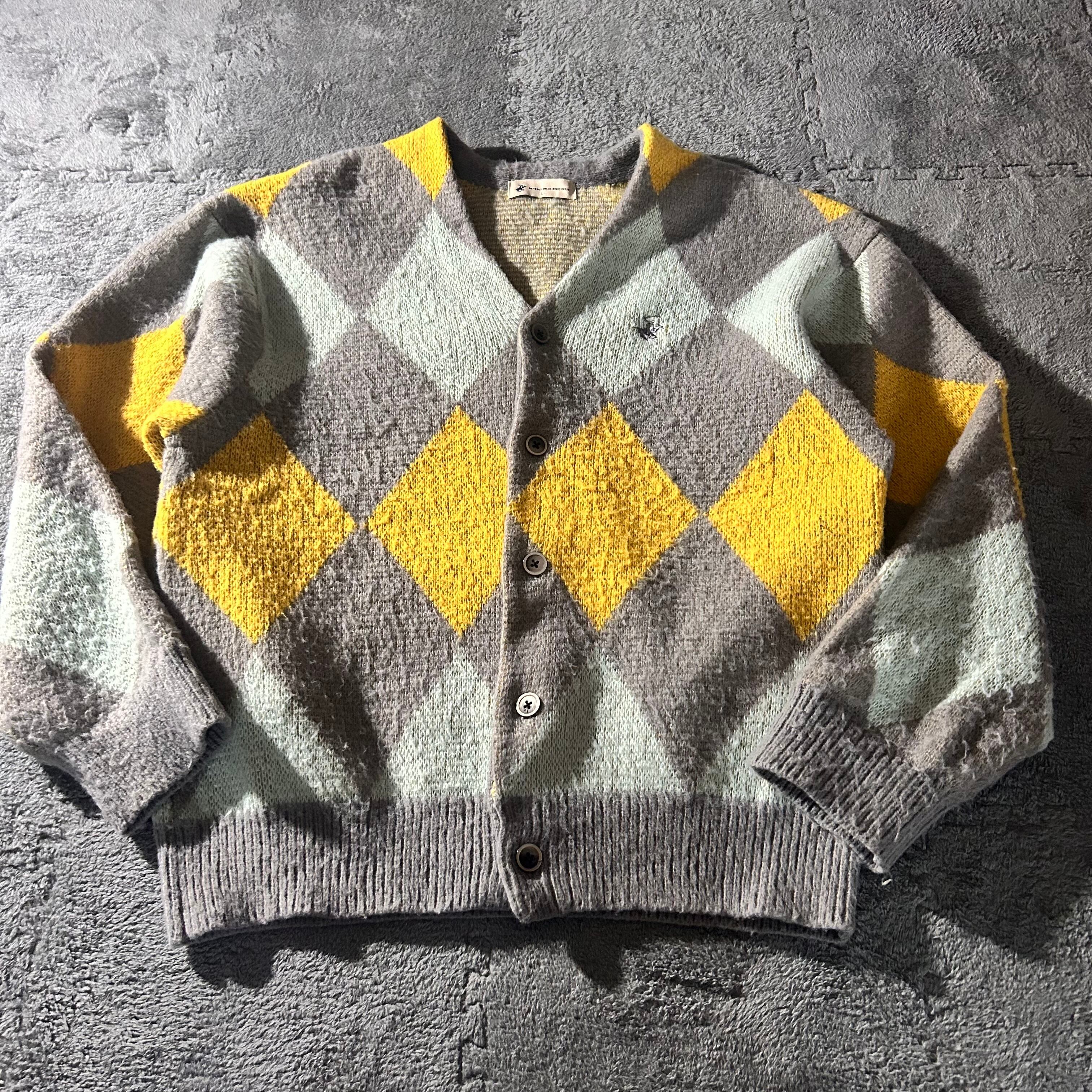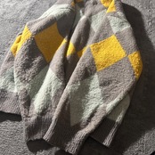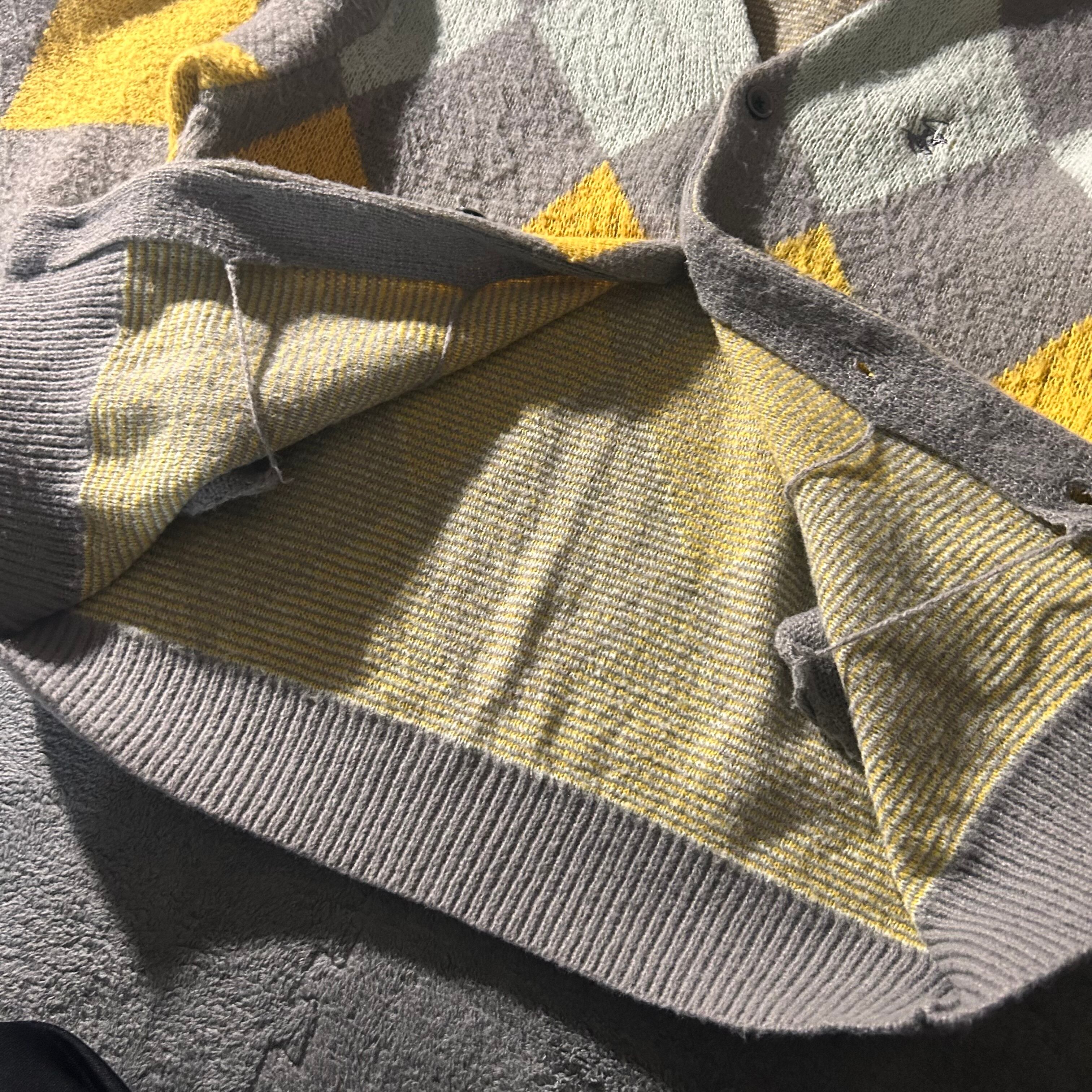 アーガイルパターンのニットセーター、Lサイズ、グレーとイエローの配色が特徴。